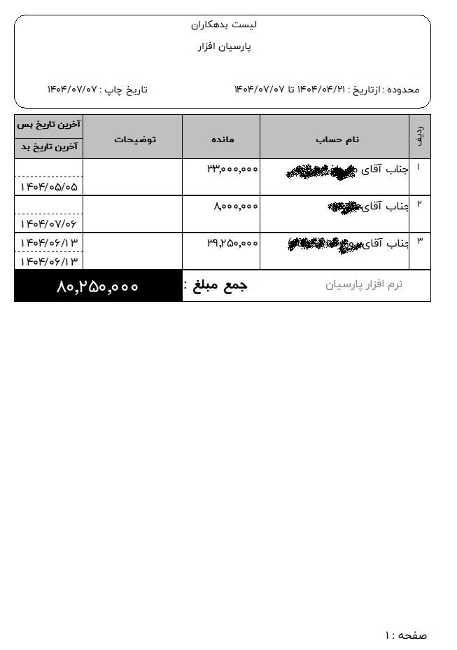 این گزارش لیست بدهکاران سایز A5 عمودی و با فونت های استاندارد بسیار خوانا و ساده طراحی شده است.